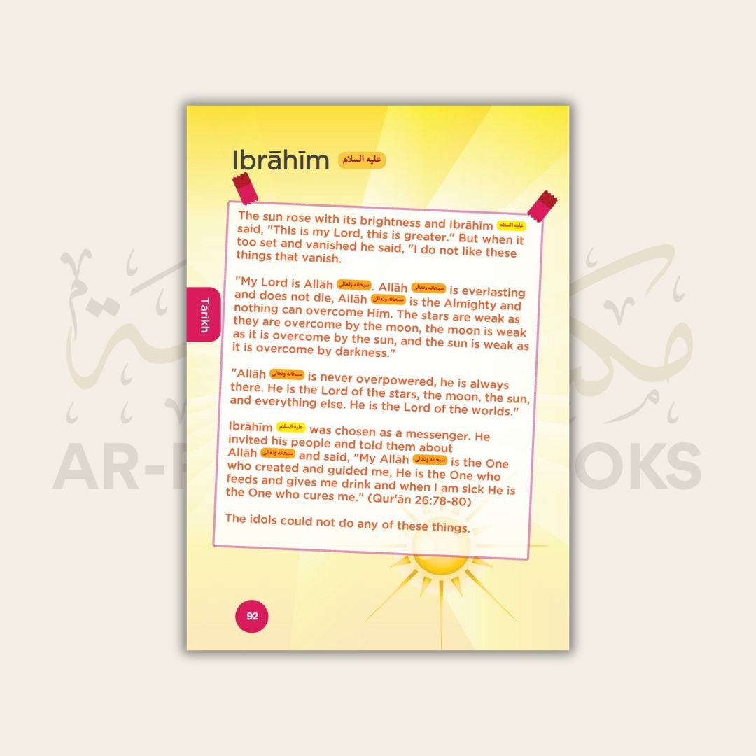 This is the third book in the series Islamic Curriculum. It includes vital themes such as salah (prayer), anecdotes from Prophet Muhammad’s sayings on being appreciative, the Prophet’s migration and voyage to Ta’if, and the stories of Ibrahim and Isma’il. You’ll also learn about various indications that are said to signal the end of the world (Qiyamah), the necessity of being kind to your parents, and how to correctly study and recite the Quran in this book.