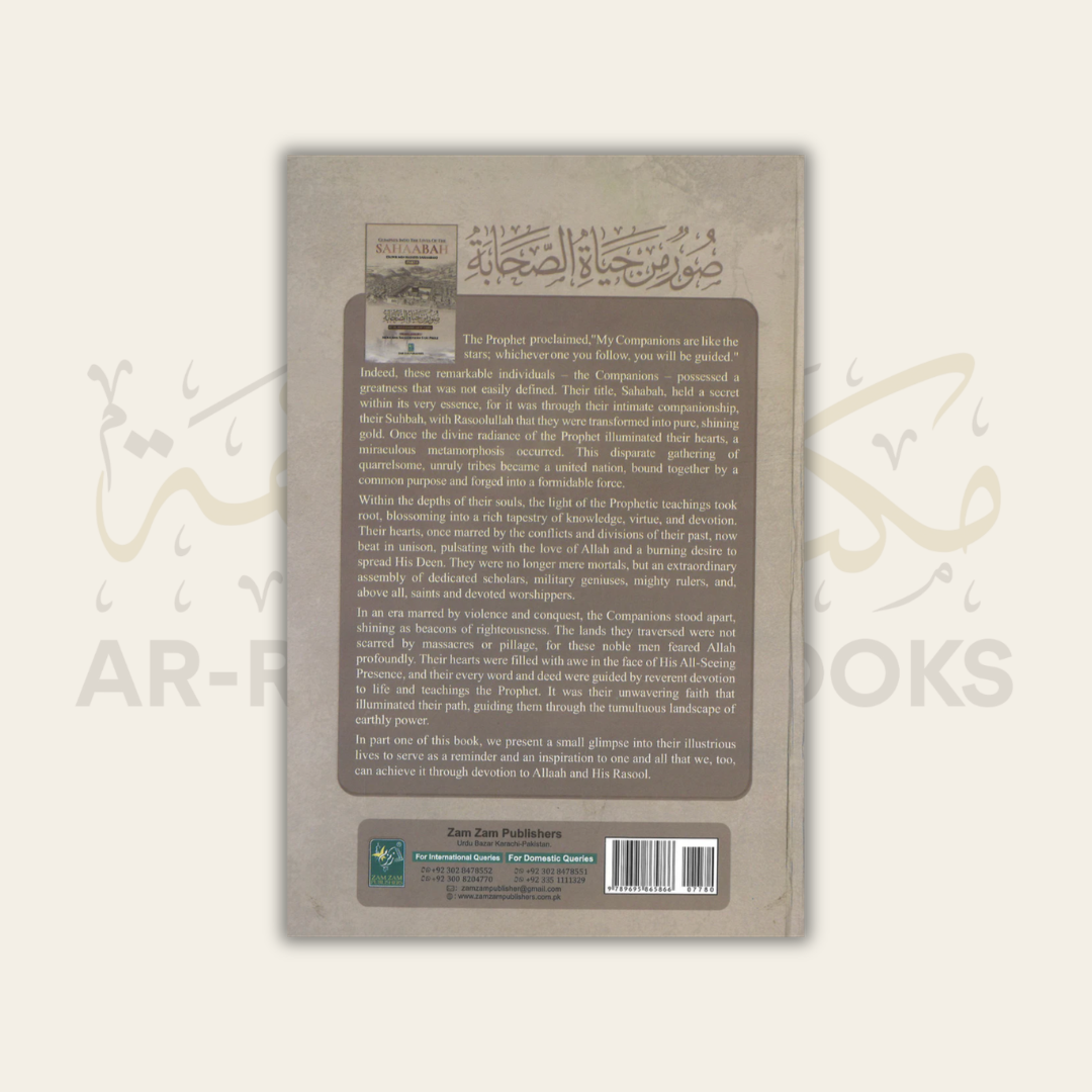 This is an English translation of the popular Arabic work, Ṣuwar min Ḥayāt aṣ-Ṣaḥābah, in which the author has presented a glimpse into the lives of the illustrious Ṣaḥābah (companions) of our Beloved Prophet ṣallallāhu ʿalayhi wa-sallam so that it may serve as a reminder and also a source of inspiration for us.