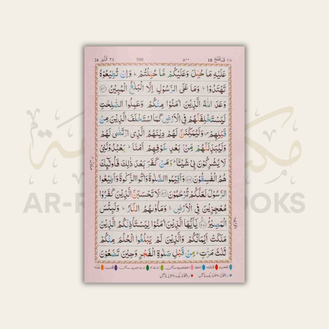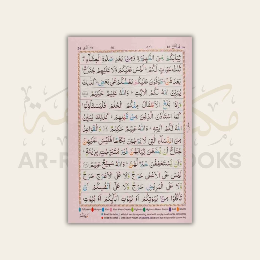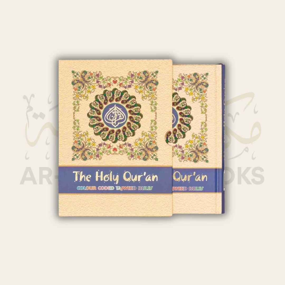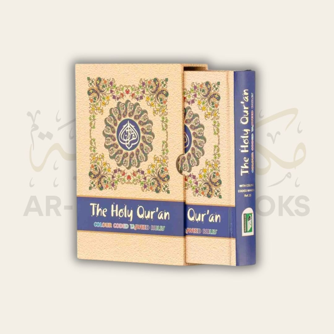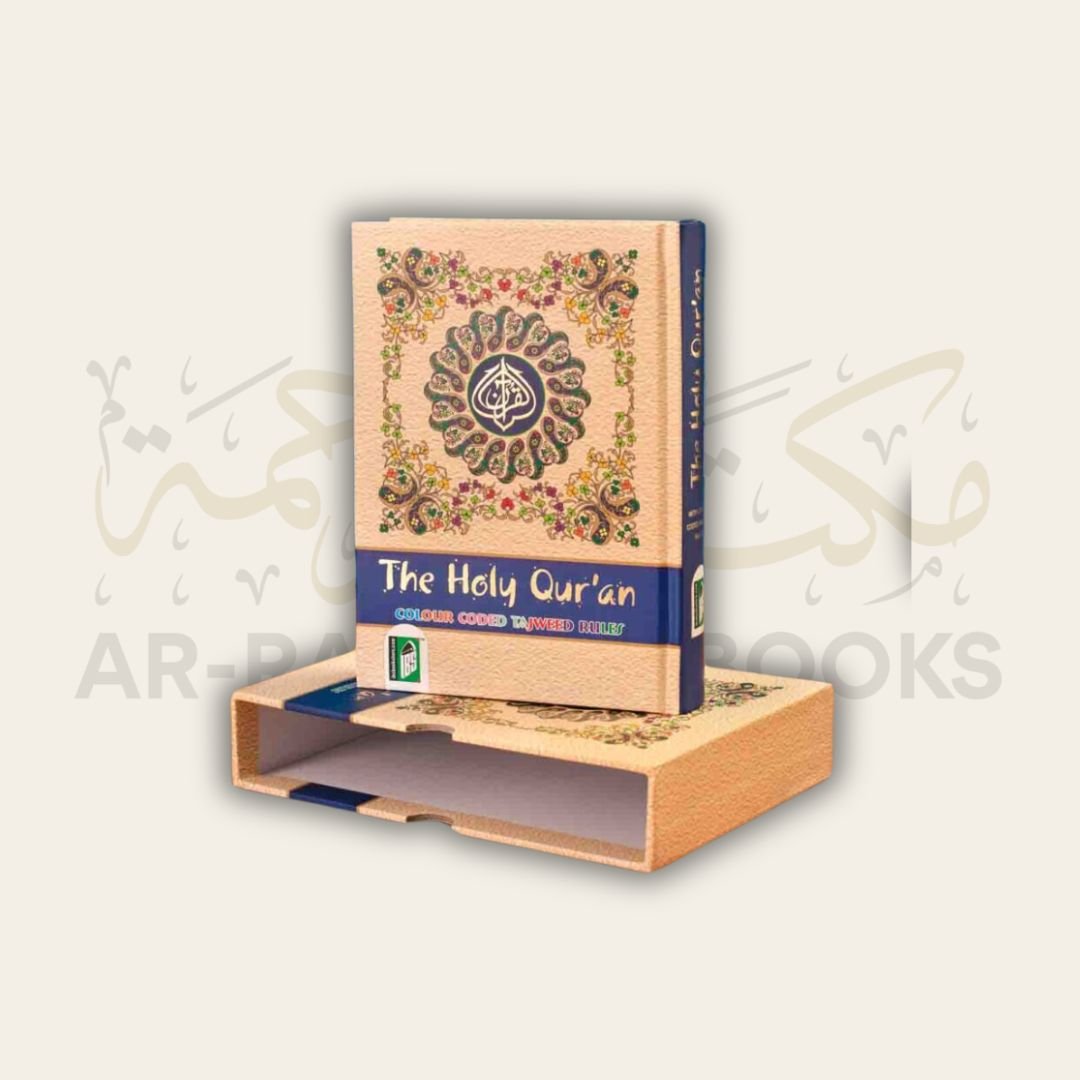 Medium sized 13-Line Mushaf with glossy paper, strong binding, and color-coded tajweed rules. It comes with a bonus slip case cover. Special Discount for Masjids and Schools!