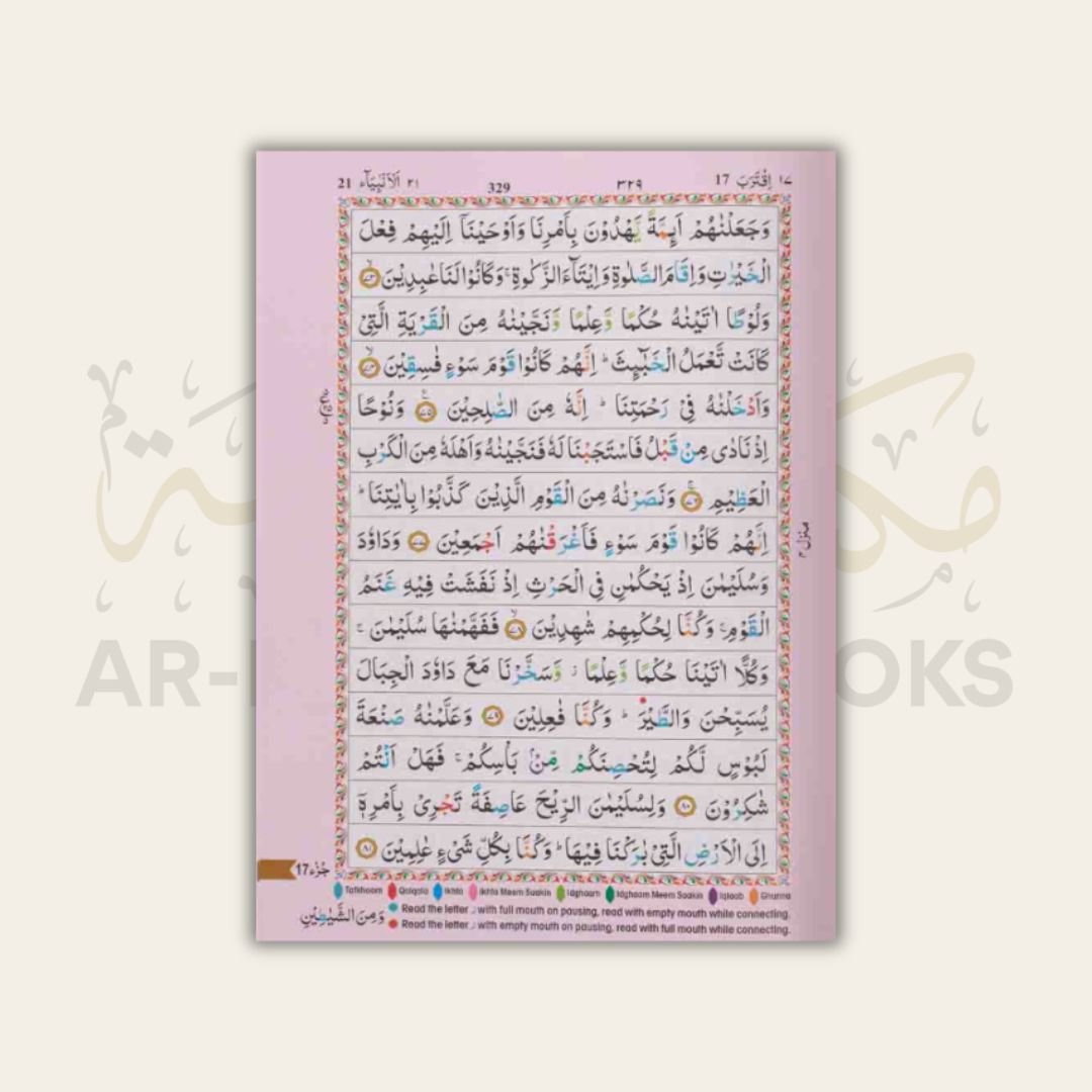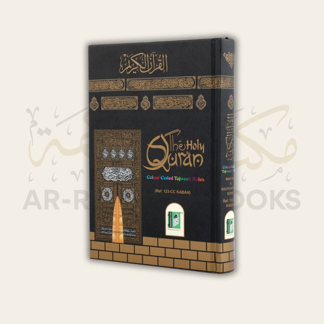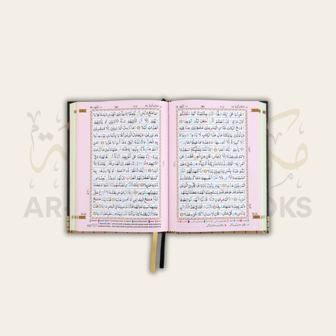 Medium sized 15-Line Mushaf with glossy paper, strong binding, and color-coded tajweed rules. It has a deluxe hardback Kaʿbah cover. Special Discount for Masjids and Schools!